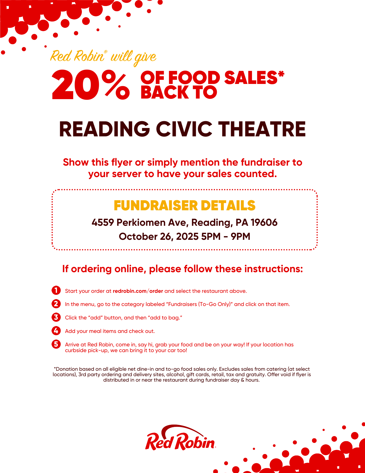 RCT is pleased to announce A “Dinner – Show ” Package with the Reading Country Club. RCC will take 10 % off your meal if you show your ticket purchase on the night/day of the show you are attending. You need to indicate that you are buying your meal under the RCT meal plan. Here is a flyer with the info: